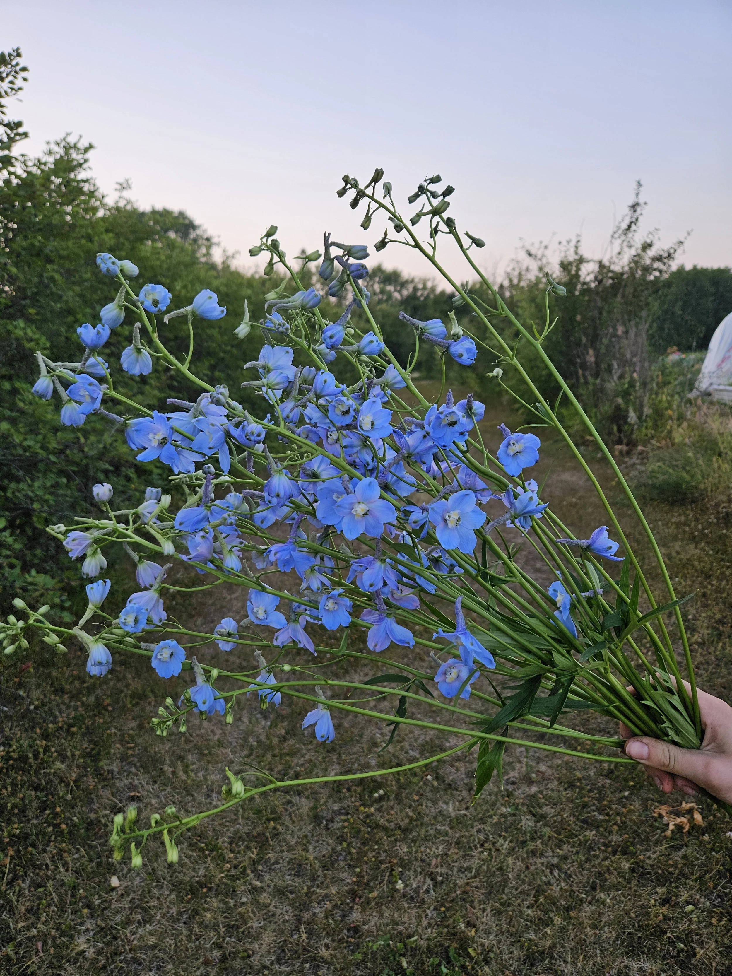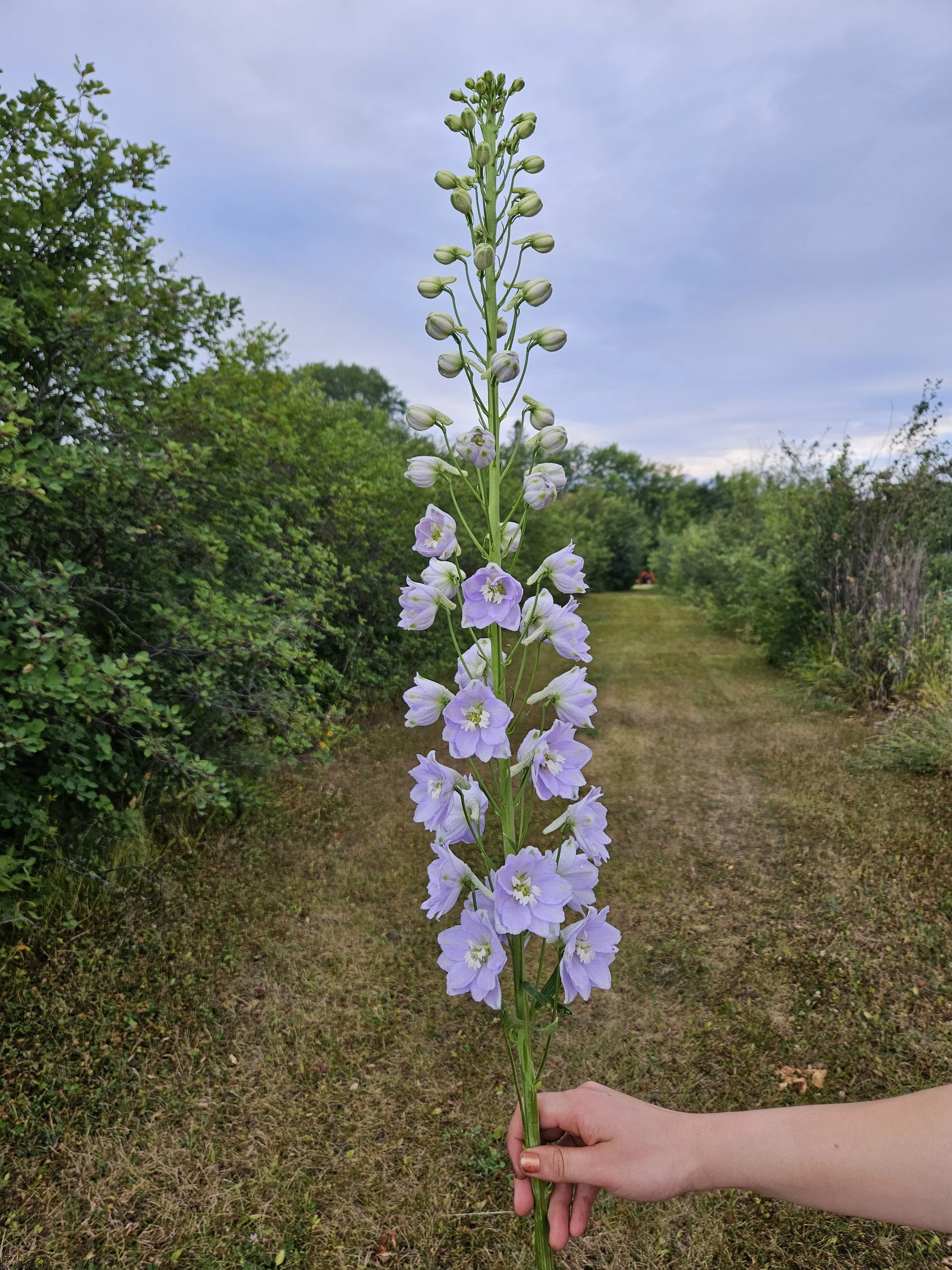 And now, my all-time favorite cultivar, Delphinium Elatum. These are hybrid cultivars designed for the florist trade, with a range of unusual and beautiful colors. The plants flower in a pyramidal shape, with the flowers held away from the stalk by long stems. The individual florets are large, and I use them in boutonnieres, corsages, and flower crowns. I have a lot of d. elatum colors in my garden, too many to name individually, but Pink Blush and Pink Princess are two stunning ones that attract lots of attention. The Candle series is a new introduction, and I trialed Candle Lavender in 2025 for the ASCFG. I hope this one will be widely available soon. It’s a very pretty color, and has been bred to flower under short day conditions. This means that it will flower with as little as 10 hours of daylight and could be grown for winter production. Because it will flower early in the year, it will produce at least one more flower stem before frost, making it a better cut flower than most, which produce a single stem per year. The seeds for these special hybrids are not readily available in garden centres but can be ordered online from one of the breeders, New Zealand Delphiniums. I interviewed the owner, Katrina Hindmarsh, for The Sustainable Flowers Podcast. She is a wealth of information about best practices in growing and breeding delphiniums. Have a listen if you’re up for a deep dive on these gorgeous hybrids. We covered seed starting, pests and diseases, and growing conditions. Lots to learn.