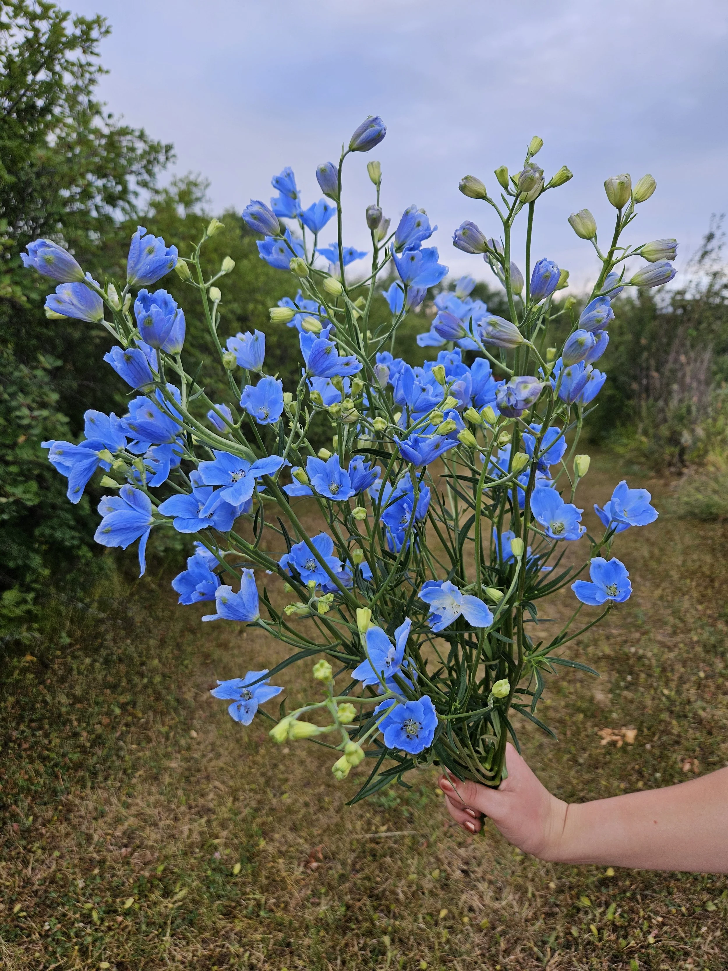 One variety I am always trying to convert gardeners and growers to is Delphinium Chinensis, also known as Delphinium Grandiflorum I think this is a fabulous cut flower and so pretty in the garden! It’s a much smaller plant, 2 feet if given lots of space, 3 feet if grown with tight spacing. It has a branchy habit, making it a great filler flower. The bees and other pollinators love it too. It’s shorter height makes staking not necessary, another bonus. If you leave the flowers to go to seed in your garden, it will readily self sow, giving you more plants next year. I start it from seed indoors and it flowers the first year but gets better and taller in subsequent years. I have tried ‘Diamonds Blue’ (electric blue), ‘Fashion Lavender’ and ‘Butterfly Blue’, ‘Pink’ and ‘White’. Brezza Light Blue is a new d. Grandiflorum I trialed for the ASCFG in 2025. It’s now my favorite because of the large flowers and intense blue color. It produces loads of branchy stems, and the color dried beautifully for me this past fall.